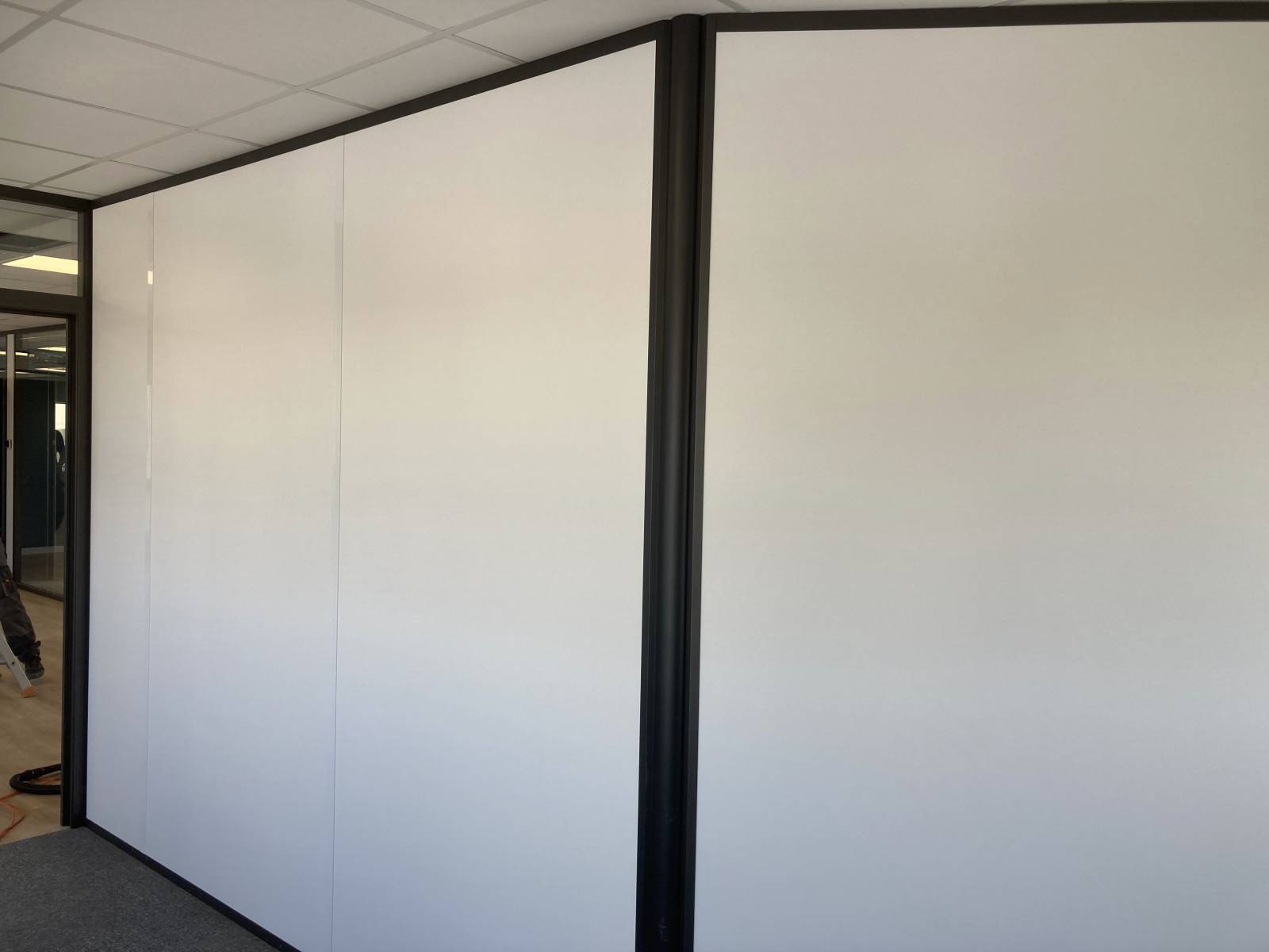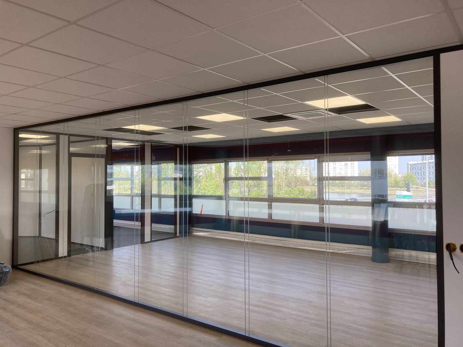 Concernant les cloisons, fourniture et pose de cloison vitrée toute hauteur double vitrage ainsi que de la cloison pleine.
